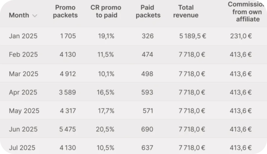 Комиссия составляет до 25% с каждой продажи. Доход масштабируется вместе с вашим трафиком, без операционных затрат с вашей стороны.